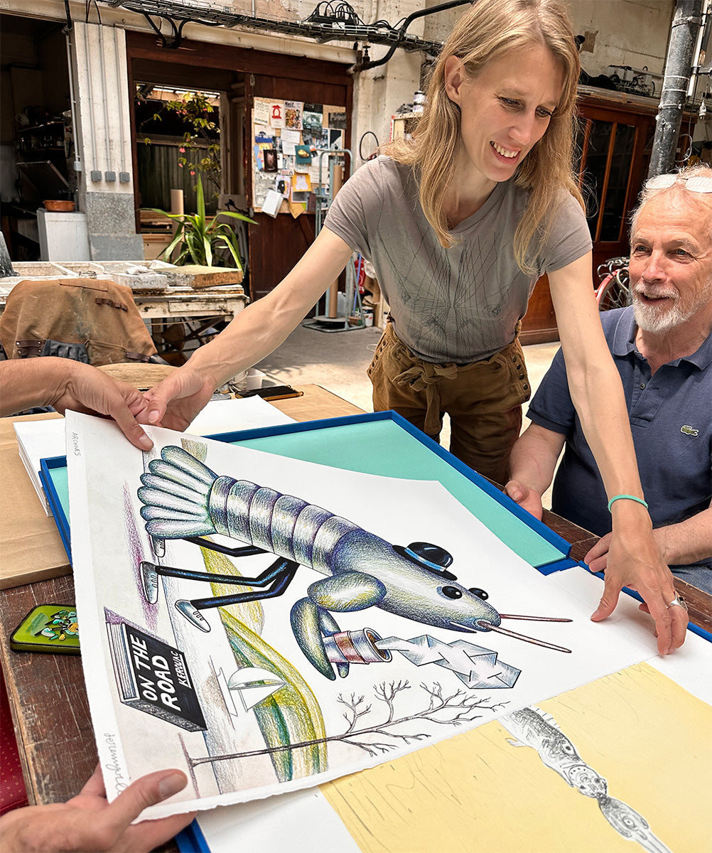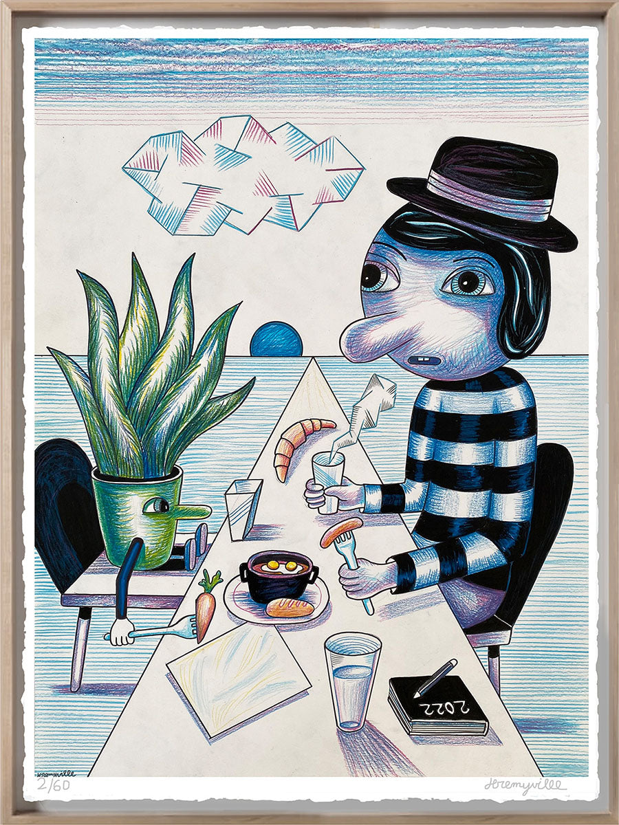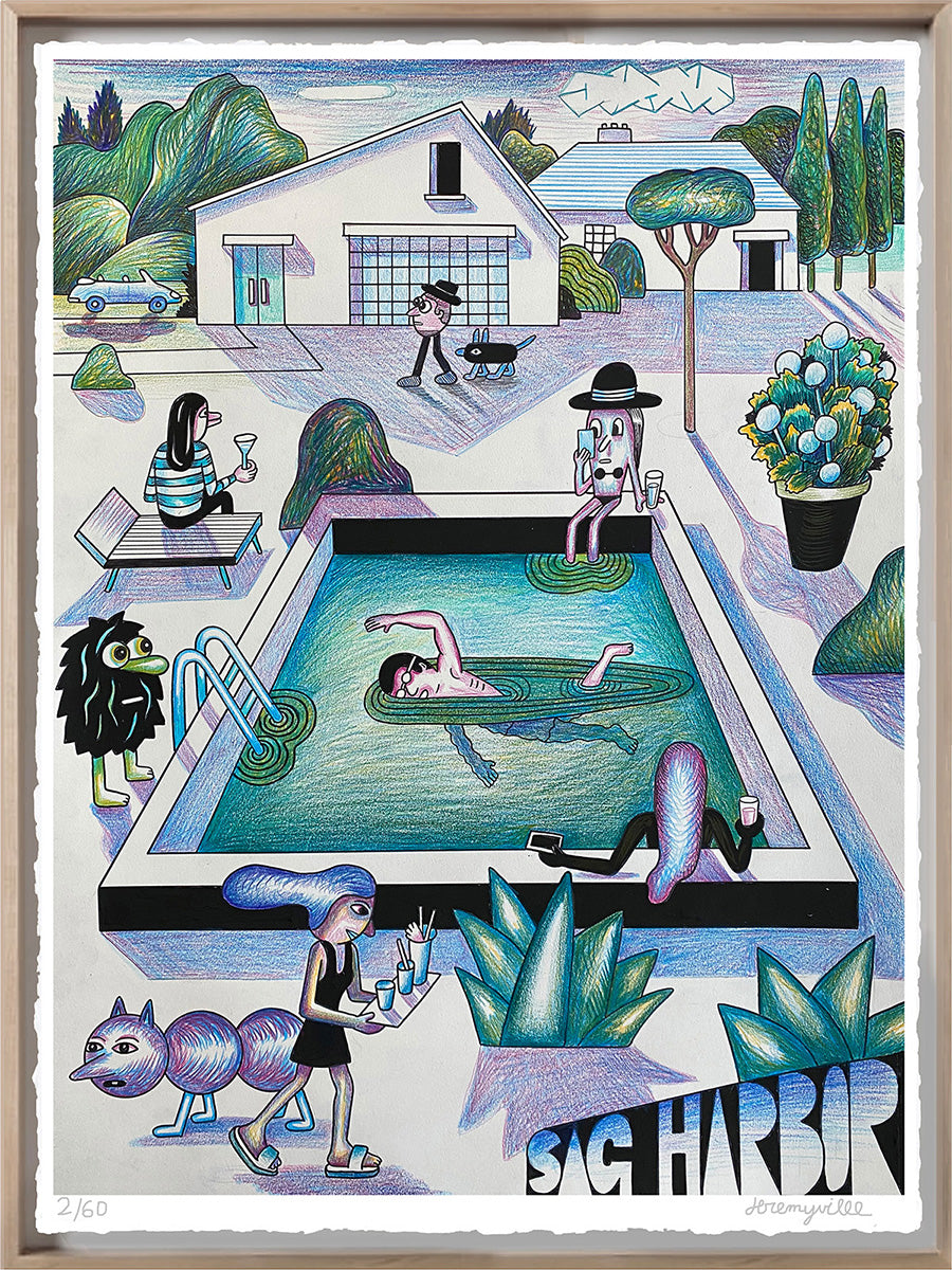 This series traces 4 days in the life of the artist, moving from the energetic streets of New York City, to the calm, spacious rhythms of the Hamptons. The scenes follow’s Jeremyville’s alter ego as he cycles through Manhattan, swims laps in Sag Harbor, shares a surrealist brunch alone, and ends on the road, with a lobster by the water. These 4 lithographs, a meditation on life, are an invitation to journey inwards. Each illustrated vignette becomes a small doorway into your imagination - a quiet place where you can sit with your thoughts for a while. Each scene mirrors a different state of mind: motion, reflection, solitude, and introspection. When you pause to view these artworks on your wall, you step into that inner landscape—discovering small truths about yourself, revealed by the artist, that live just beneath the surface. Each print is a gentle, daily reminder to pause, breathe, and return to a moment of introspection a portal into your subconscious.