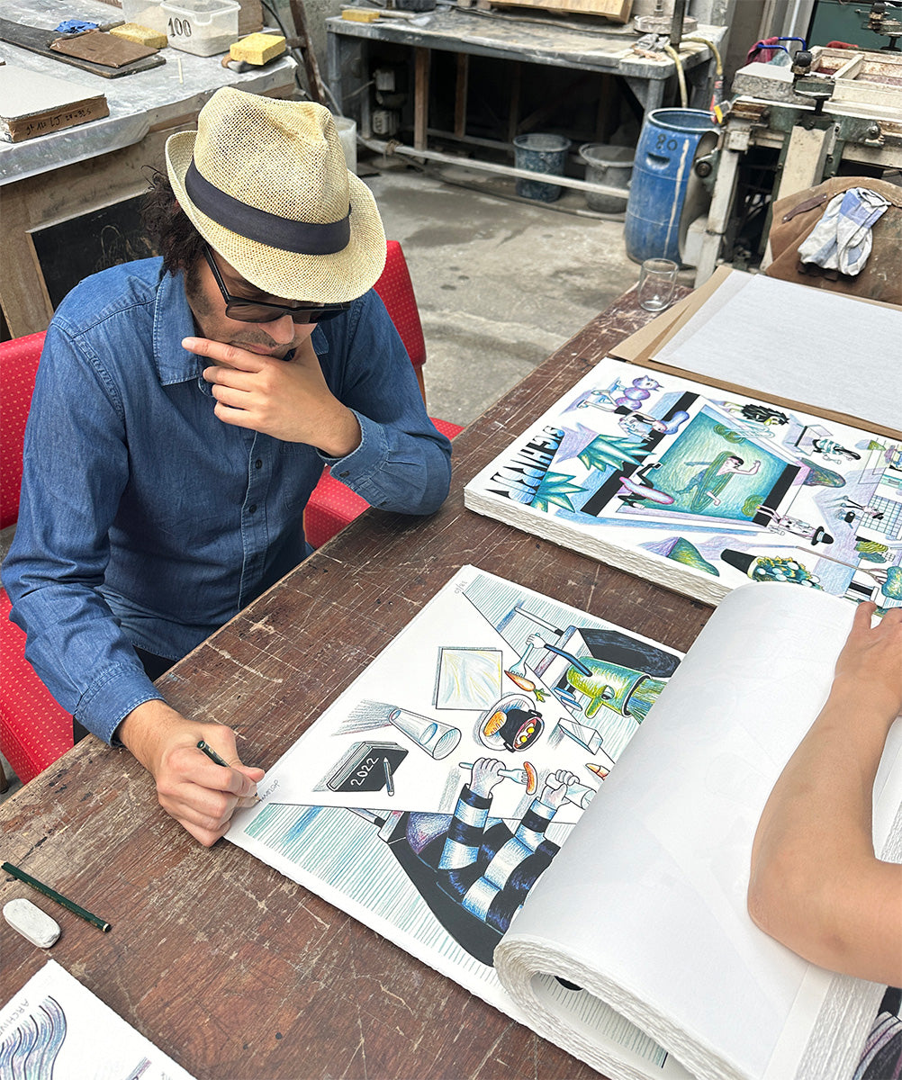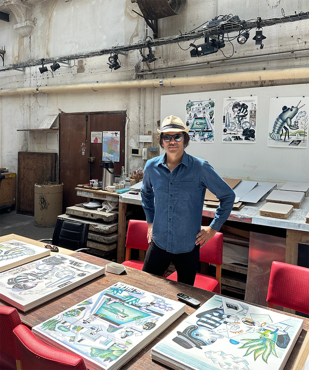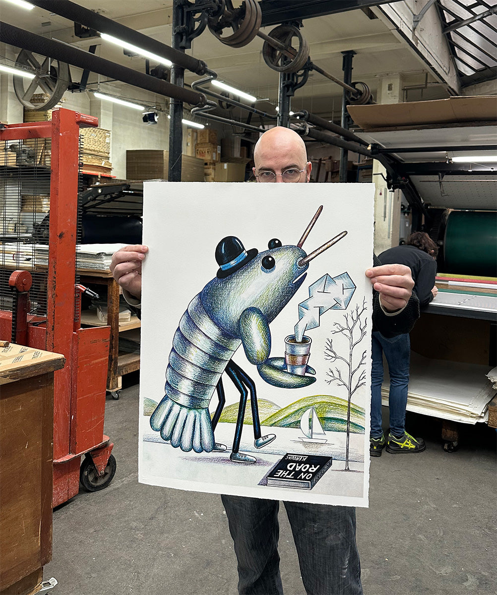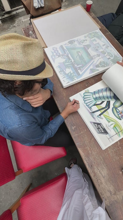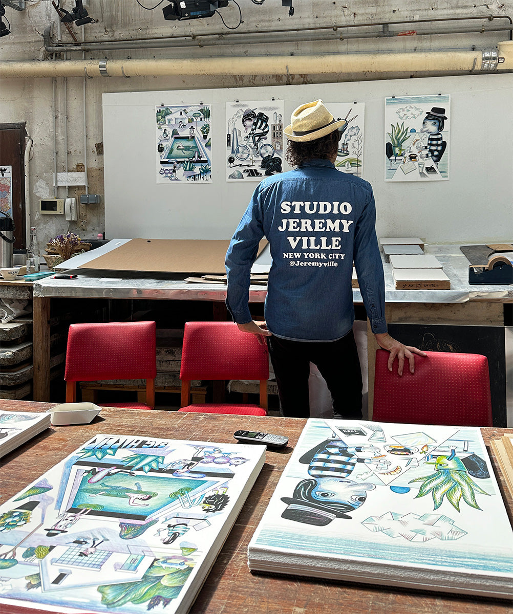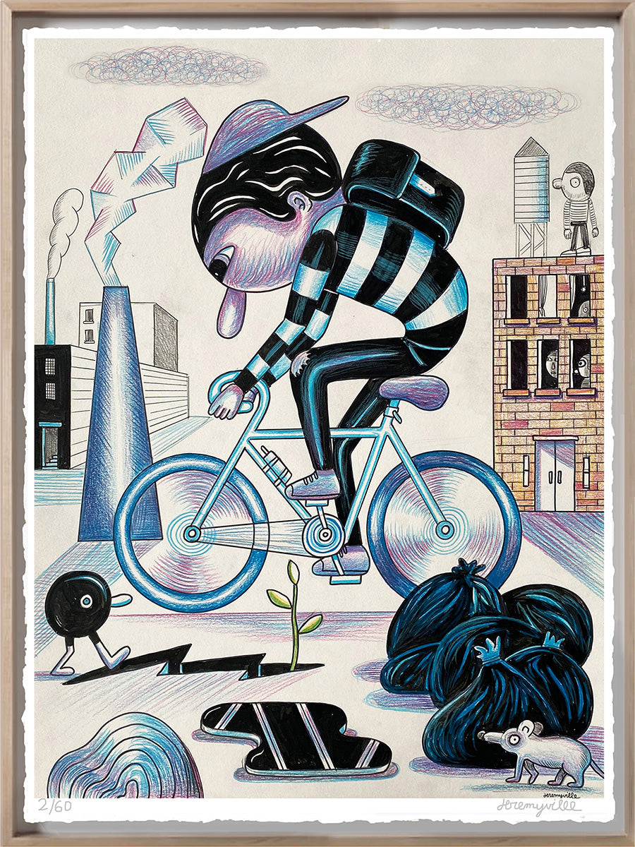 This series traces 4 days in the life of the artist, moving from the energetic streets of New York City, to the calm, spacious rhythms of the Hamptons. The scenes follow’s Jeremyville’s alter ego as he cycles through Manhattan, swims laps in Sag Harbor, shares a surrealist brunch alone, and ends on the road, with a lobster by the water. These 4 lithographs, a meditation on life, are an invitation to journey inwards. Each illustrated vignette becomes a small doorway into your imagination - a quiet place where you can sit with your thoughts for a while. Each scene mirrors a different state of mind: motion, reflection, solitude, and introspection. When you pause to view these artworks on your wall, you step into that inner landscape—discovering small truths about yourself, revealed by the artist, that live just beneath the surface. Each print is a gentle, daily reminder to pause, breathe, and return to a moment of introspection a portal into your subconscious.